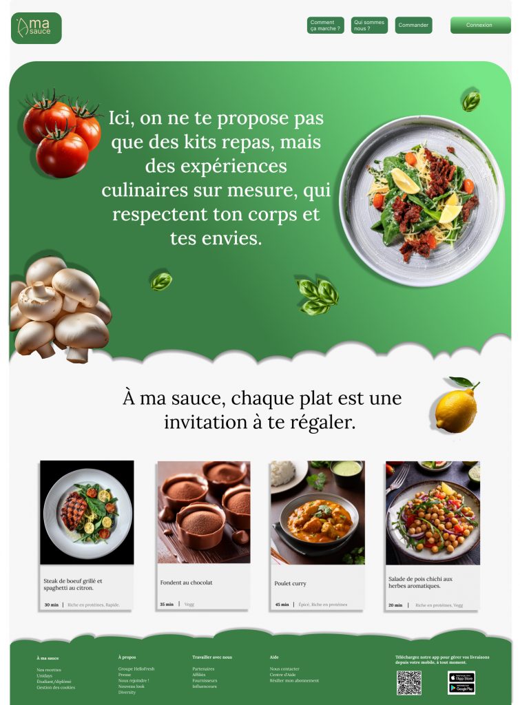 Développé avec une amie, À ma sauce est un concept de kits repas nouvelle génération. L’idée : aller plus loin que la simple livraison de recettes, en proposant une expérience culinaire personnalisée, adaptée non seulement aux goûts, mais aussi aux besoins nutritionnels spécifiques (allergies, intolérances, pathologies, régimes spéciaux).